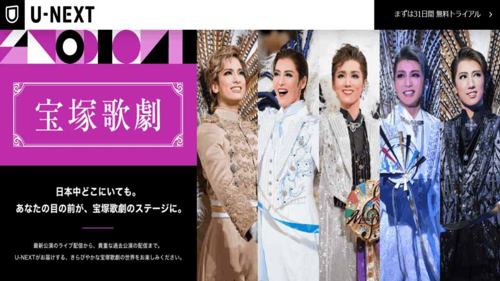 月額2,189円(税込)で利用できるU-NEXTには残念ながら宝塚の見放題のプランはありませんが、定期的に宝塚公演のライブ配信を行っています。