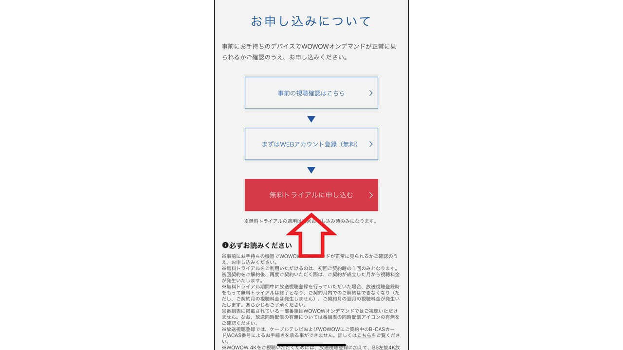 WOWOWの無料体験を登録する手順は、WOWOWオンデマンドと放送経由で少し違います。