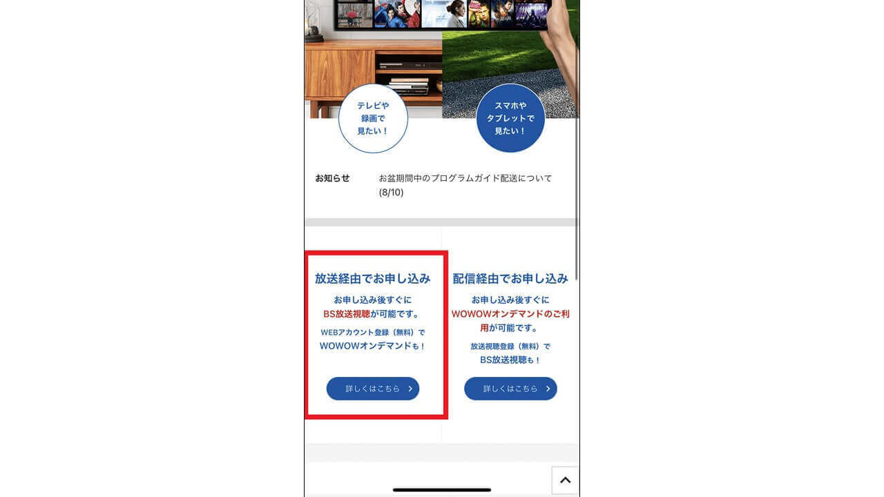 WOWOW公式サイトを開いたら下にスクロールし、「お申し込みはこちら」をクリックしましょう。