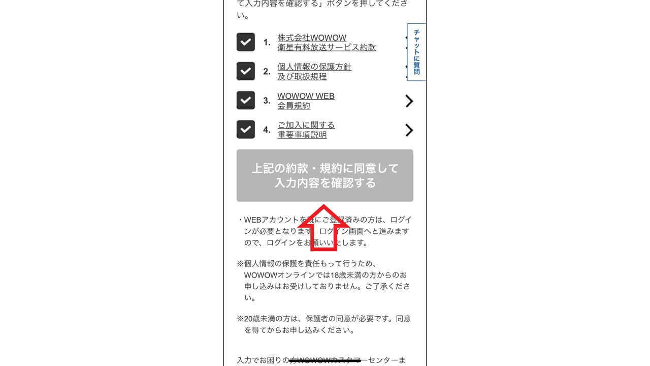 すべて入力できれば、利用規約などの欄にチェックを入れて「上記の約款・規約に同意してい入力内容を確認する」をクリックしてください。