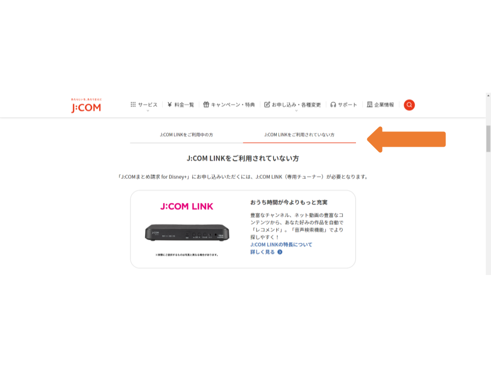 J:COM LINKをご利用中の方は、「J:COMまとめ請求 for ディズニープラス」の流れから「J:COMまとめ請求 for ディズニープラス」のお申し込みをクリックします。