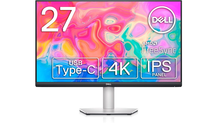 Dellの4Kモニターです。27インチのワイドモニターで、3辺が超薄型のフレームレスデザイン。スタンドは、高さ・前後角度・左右角度が調節でき、モニターを回転させることもできます。モニター単体の壁掛けもできますよ。