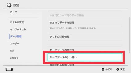 - それぞれの本体で「データ管理」→「セーブデータの引っ越し」を選択