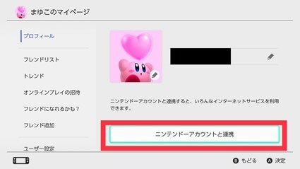 - 「プロフィール」→「ニンテンドーアカウントと連携」を選択