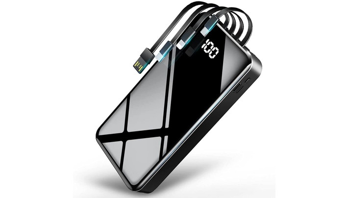 ISSURIAのモバイルバッテリーです。本体充電用USBケーブルと3つの入力用ケーブル(Lightning、Type-C、micro USB)の4種のケーブル内蔵型で最大4台同時充電できます。ケーブルを別途用意したり持ち運ぶ必要がないのは嬉しいですね。