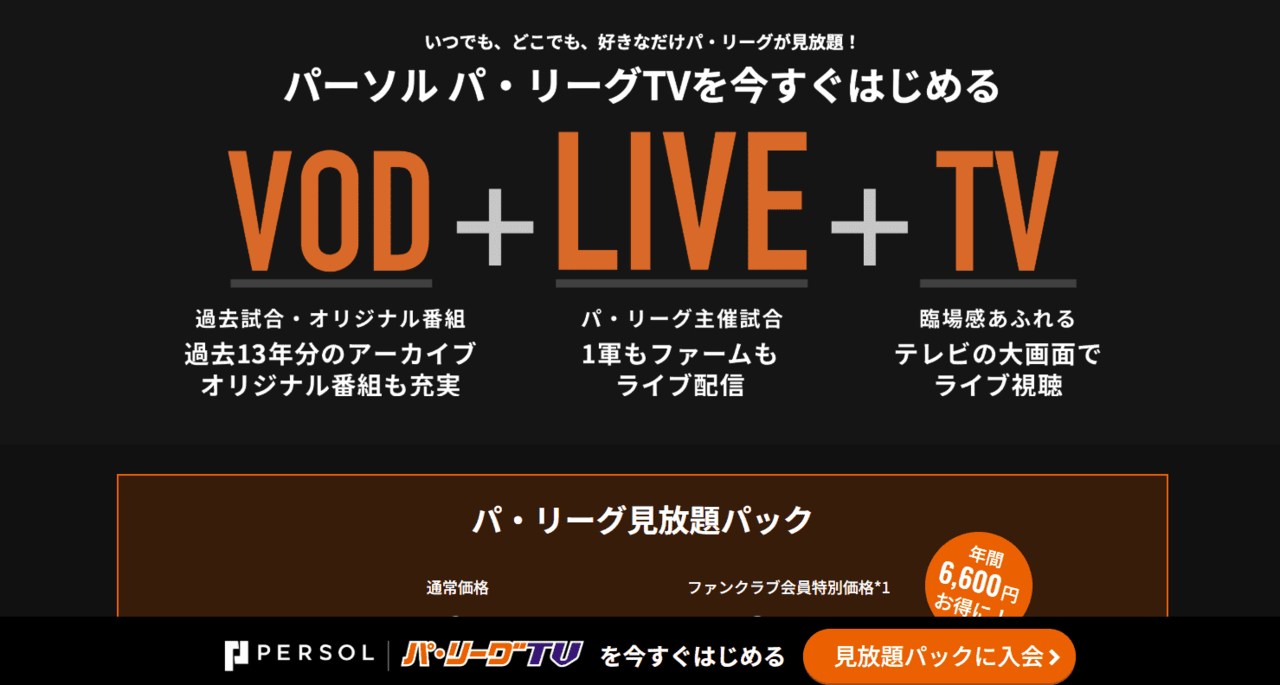 | ベースボールLIVE【新規無料トライアル】 | 1か月間 | パ・リーグ6球団の主催試合、交流戦、クライマックスシリーズなど | 月額660円 |