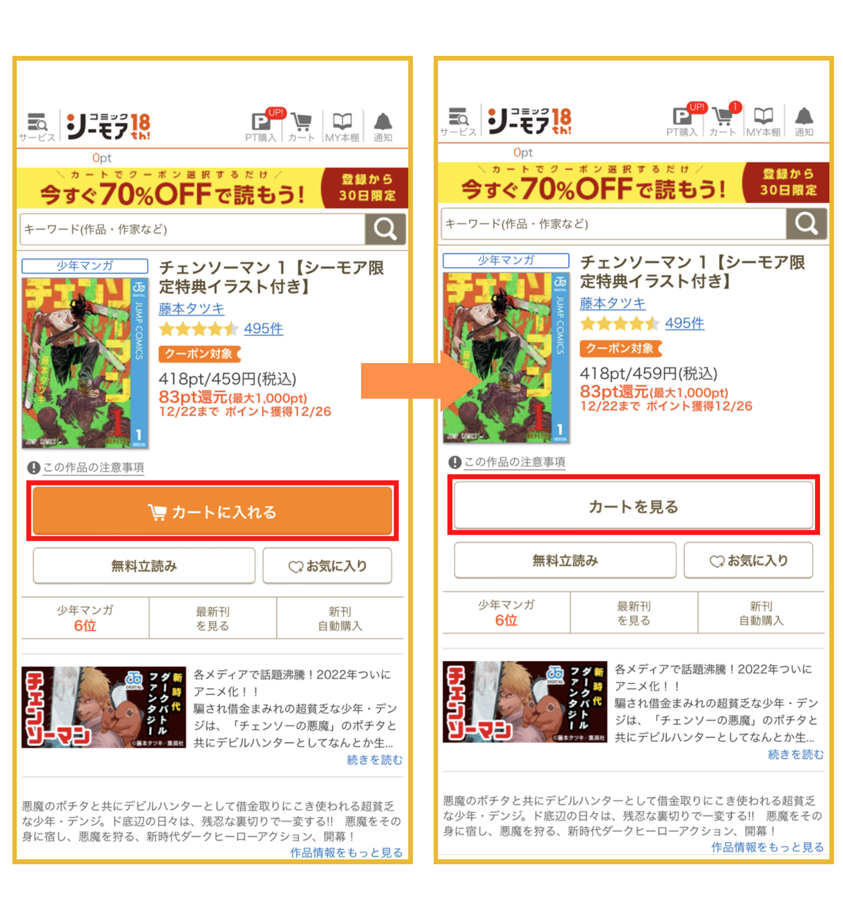 コミックシーモア公式サイトで読みたい電子書籍を探し、「カートに入れる」→「カートを見る」の順でをタップします。