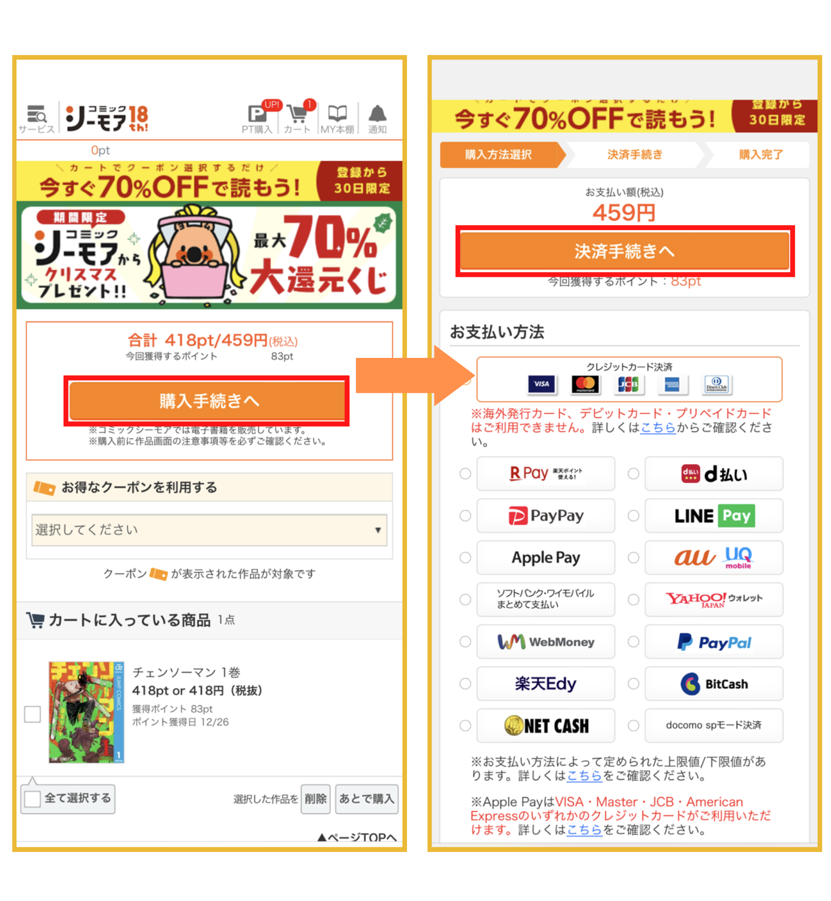 次に、「購入手続きへ」をタップします。クーポンを所持している場合は、ここで選択します。 - 支払い方法を選択し、「決済手続きへ」をタップする