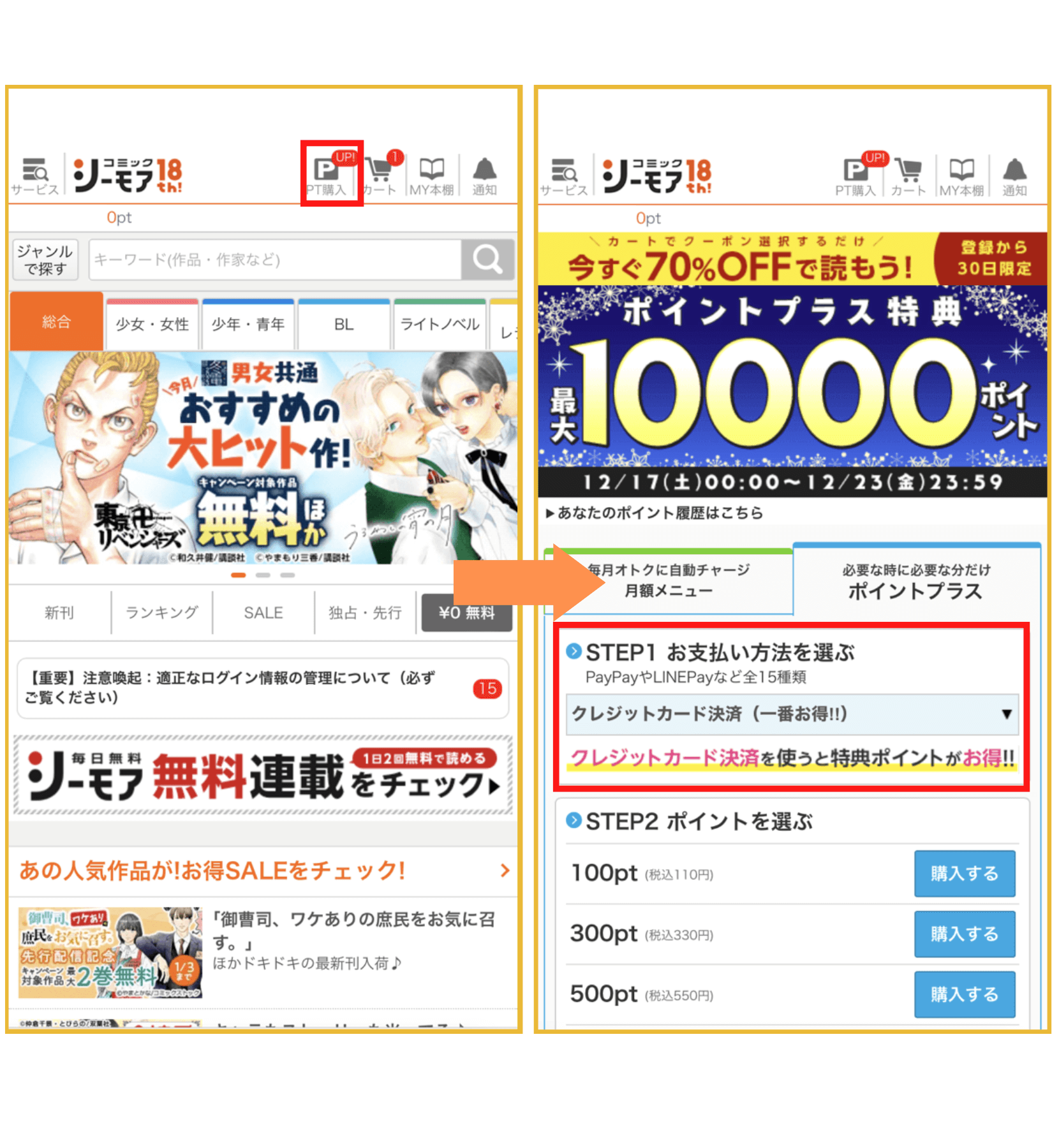 画面上部の「PT購入」ボタンを押し、次に「ポイントプラス」のタブから支払い方法を選択しましょう。