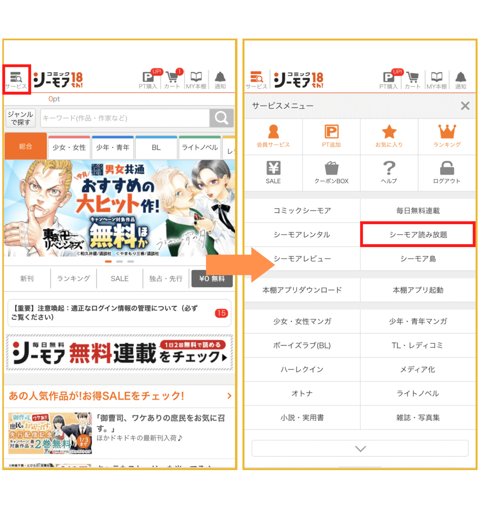 画面左上部の「サービス」をタップします。その後、「シーモア読み放題」を選択しましょう。