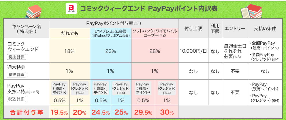 | ebookjapan | 20~30%(毎週金土日) ・PayPay祭30~50% |