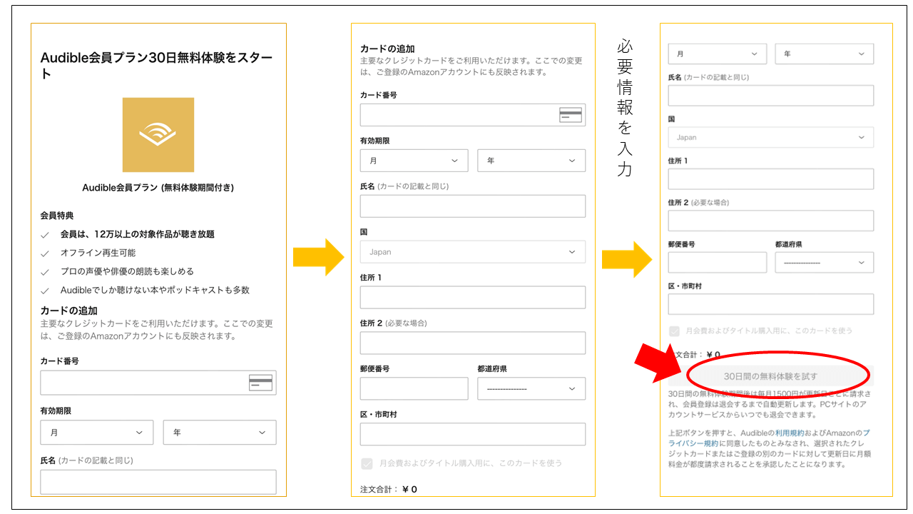 カード番号や氏名、住所など、必要な情報を入力し、最後に「無料体験を試す」をクリックすれば、Audibleの会員登録は完了です。
