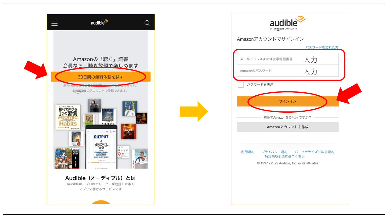 Audibleの会員登録を行うには、Audibleのサイトから下記の手順に沿って行いましょう。
