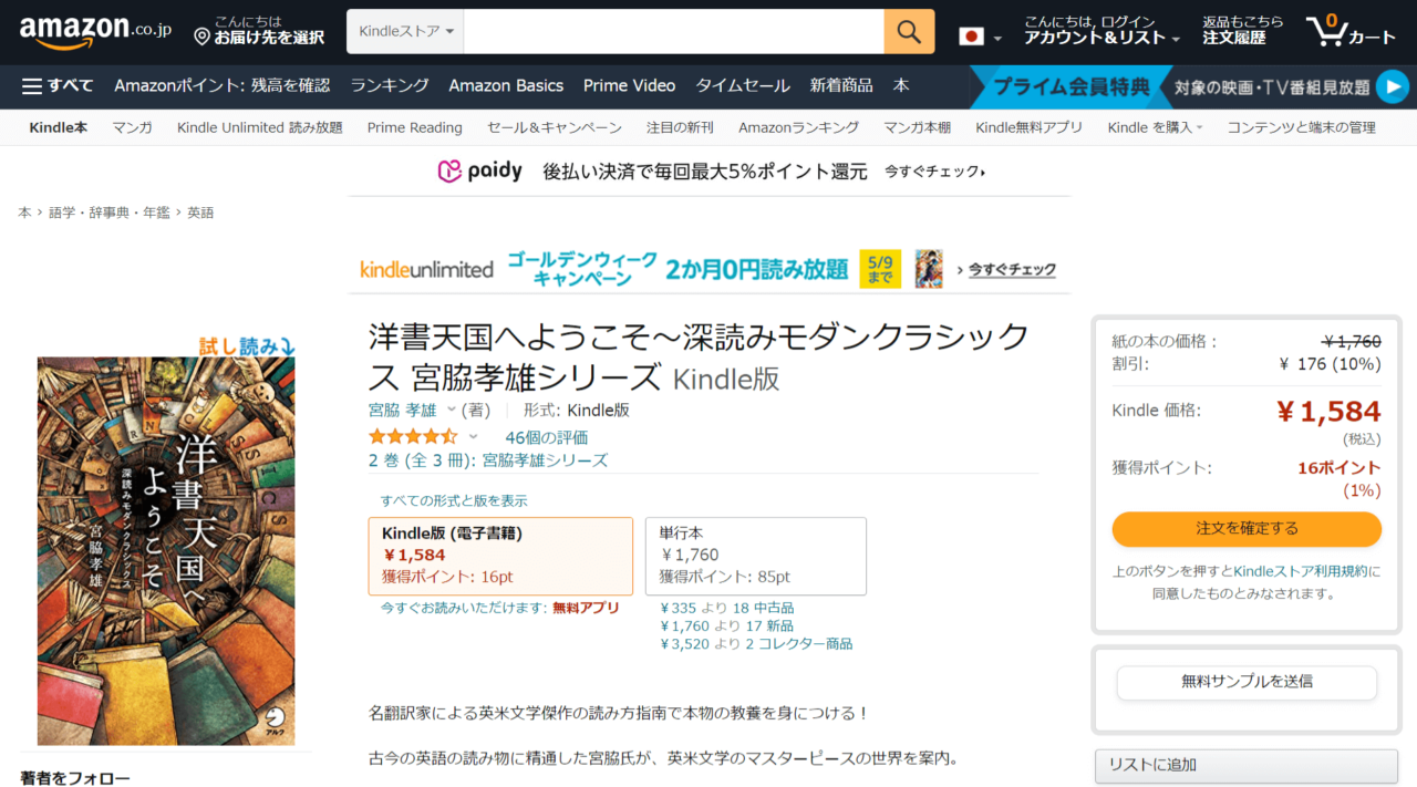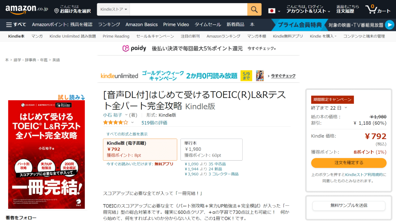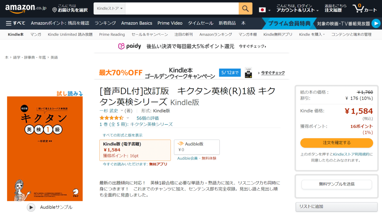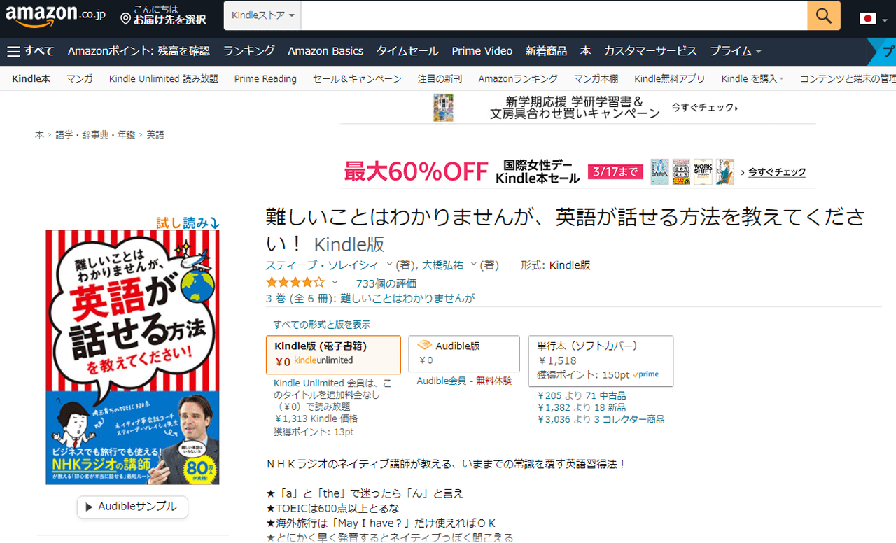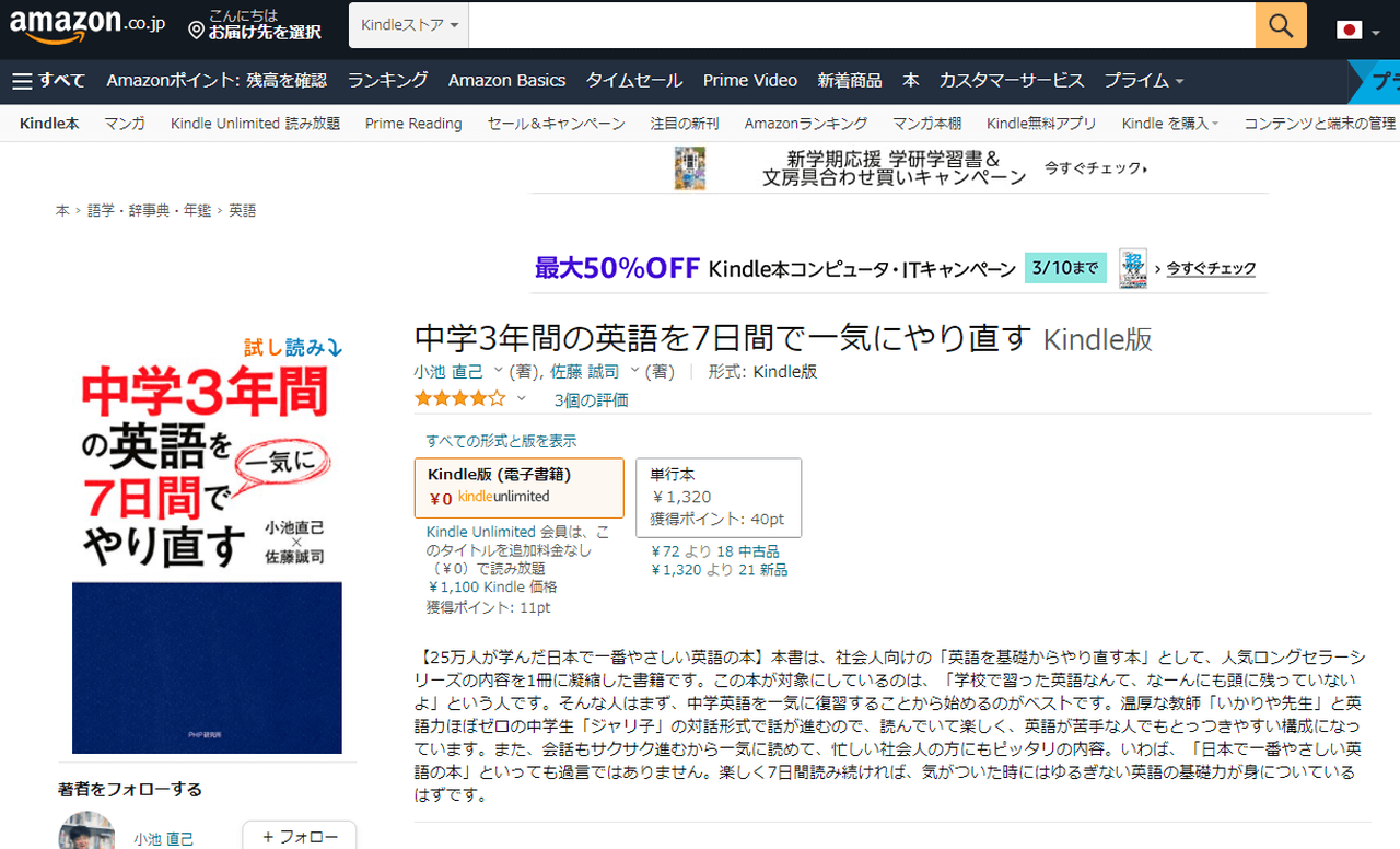 しかし、電子書籍サービスでは洋書・英語学習本の取り扱いが徐々に増えています。Amazonで英語の参考書を見てみても、多くの場合ではKindleでの書籍購入が可能です。キャンペーンなどを利用すればさらにお得に購入できるので、まずは自分の買いたい本があるかをチェックしてみてください。