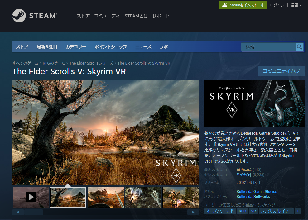 参考:Steamストア『The Elder Scrolls V: Skyrim VR』