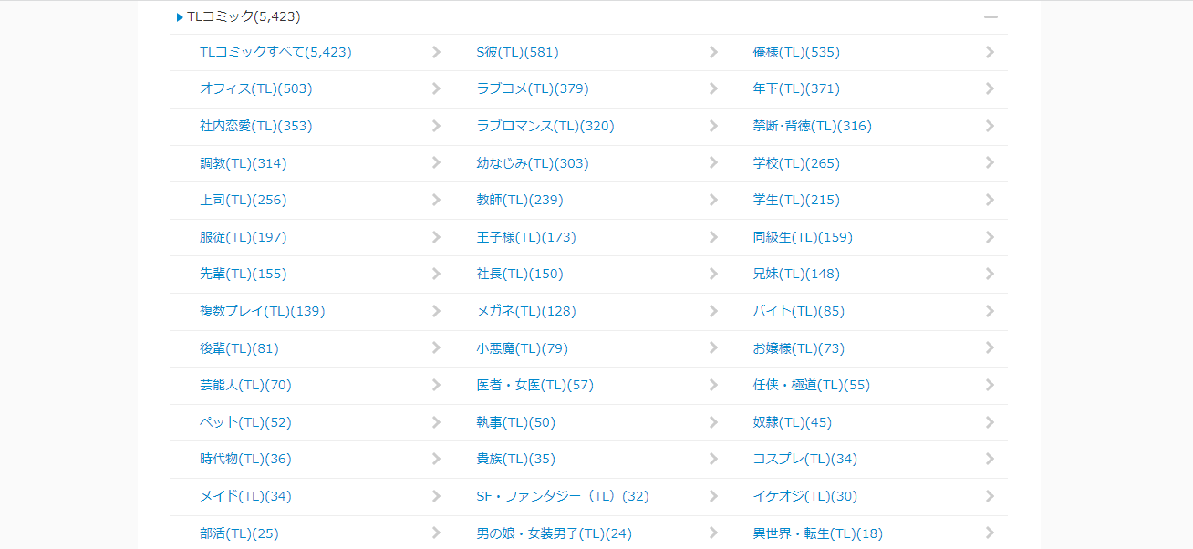 シーモア読み放題フルでは、画像のように5000タイトルを超えるTL漫画が細かいジャンルに分かれていて好みの作品を探しやすい魅力があります。