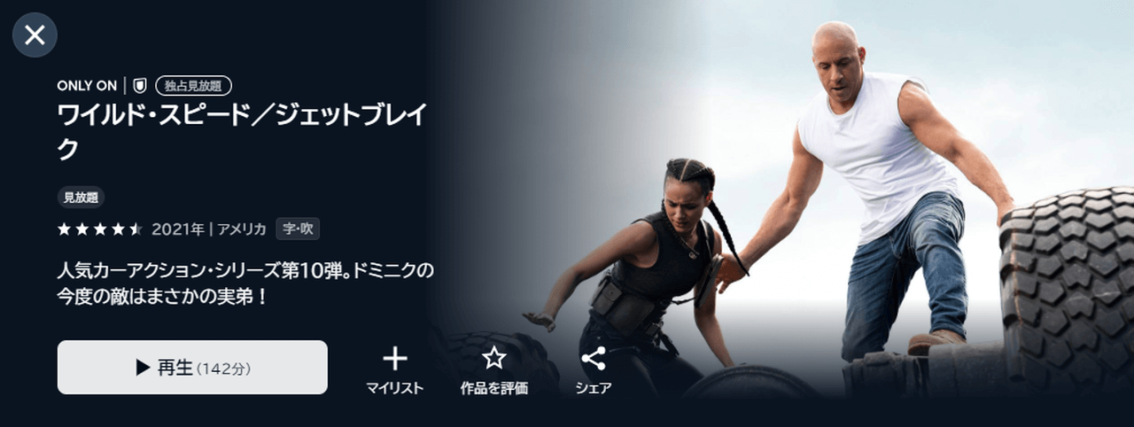 「ワイルド・スピード」シリーズは、2021年に公開された「ワイルド・スピード/ジェットブレイク」まで見放題!最新作も付与ポイントを利用してレンタルできます。