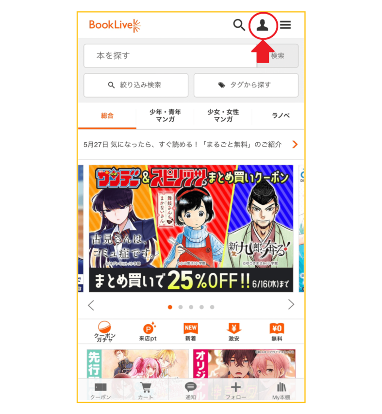 まず、ブックライブのトップページにある「Myページ(人型マーク)」をタップします。