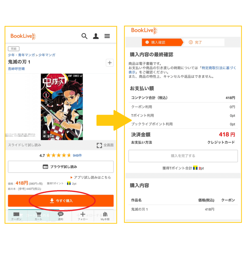 まず、購入したい作品を検索し、作品ページにある「今すぐ購入」ボタンをクリックすると、購入画面に移ります。