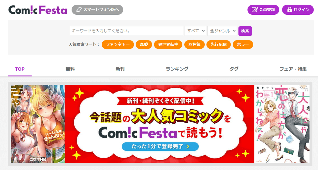 100万作品を扱うコミックフェスタは、電子書籍サービスのなかでも品揃えが豊富なサイトです。