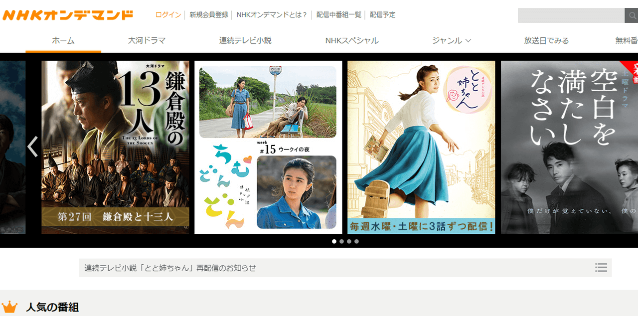 NHKの地上番組と衛星番組から、月約500本の番組が放送当日か翌日から配信されます。それに加えて、1万本の名作ドラマやドキュメンタリーが視聴できます。