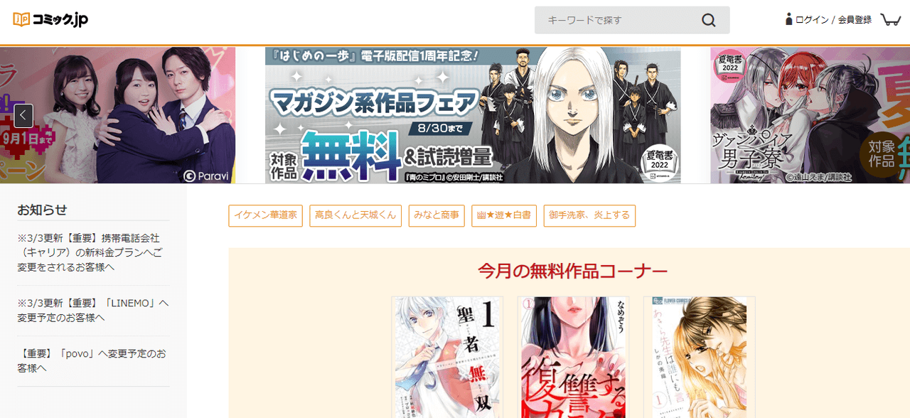 また、コミック.jpは無料作品も豊富で、アニメ化やドラマ化した人気作がたくさん無料配信されています。『魔入りました!入間くん』やその他漫画のみを読みたい人は、コミック.jpに登録するといいでしょう。