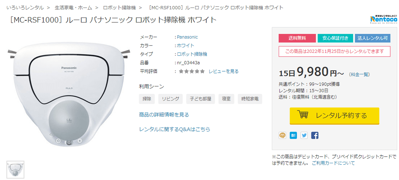 全国送料無料・即日発送・当日レンタルOKと、使い勝手が抜群にいいモノカリ。ロボット掃除機の種類は3種類しかありませんが(2022年11月現在)、レンタルサービスの中では珍しい「短期レンタル」が可能な会社です。