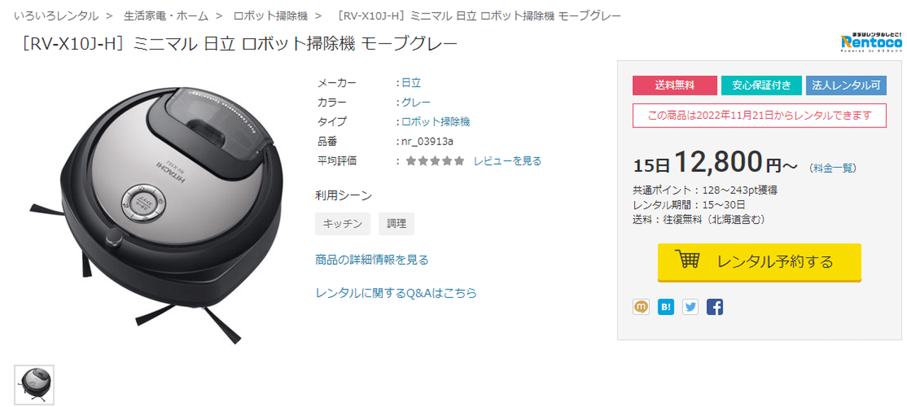 kikitoの場合、購入すると10万円以上する「ルンバJ9」が月額3,480円でレンタルできます。初期費用の安さは魅力的ですね。