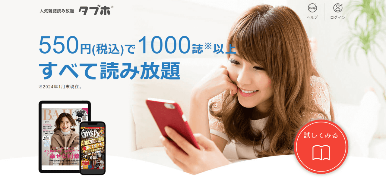 タブホは、月額550円(税込)で1,200誌以上の雑誌が読み放題で楽しめる電子書籍サービスです。