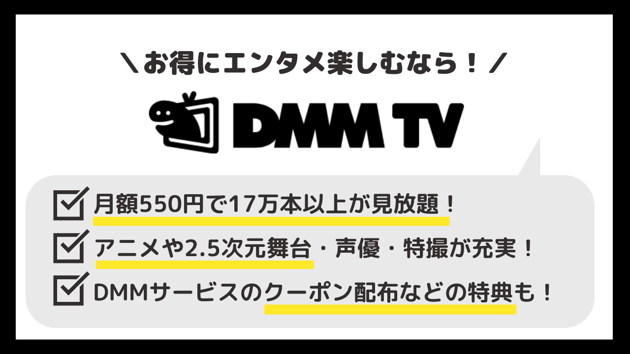 アニメを中心に、特撮や2.5次元舞台、エンタメなど様々なジャンルの映像作品を高コスパで見たい人は、下のボタンをタップしてDMM TVを無料体験してくださいね!