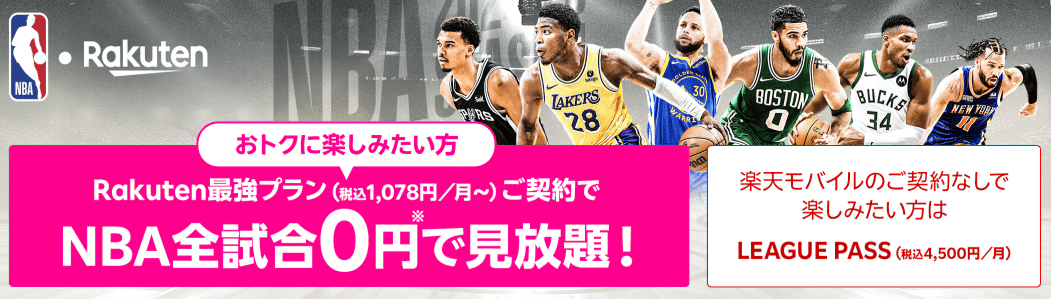 楽天モバイルの「Rakuten最強プラン」および「Rakuten最強プラン(データタイプ)」を契約しているすべての方は、「NBA Rakuten」の「NBA LEAGUE PASS for 楽天モバイル」が無償提供されます。