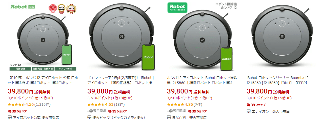 楽天市場では、ルンバi2が送料無料で39,800円と最安値です。(2024年2月5日時点)