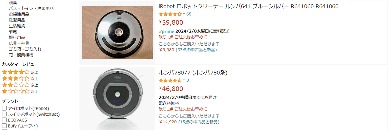 Amazonでは、ルンバ641が送料無料で39,800円と最安値です。(2024年2月5日時点)