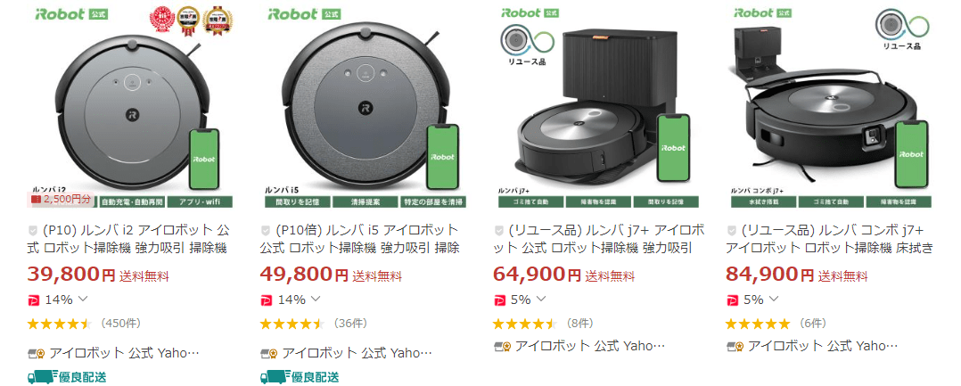 | Yahoo!ショッピング | ・ルンバの正規代理店なので安心 ・PayPay決済可能 ・PayPay祭やポイント10倍キャンペーン時には大量ポイントをGETできる (※ルンバが対象になるかは未定) |