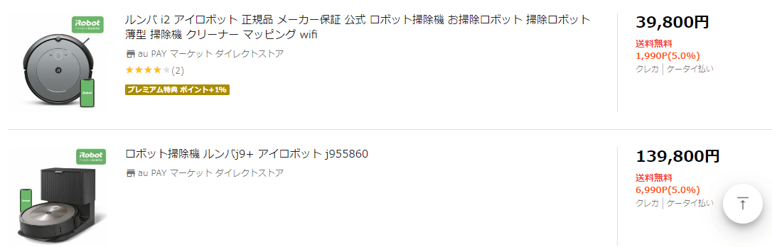 auPAYマーケットでは、ルンバi2が送料無料で39,800円と最安値です。(2024年2月5日時点)