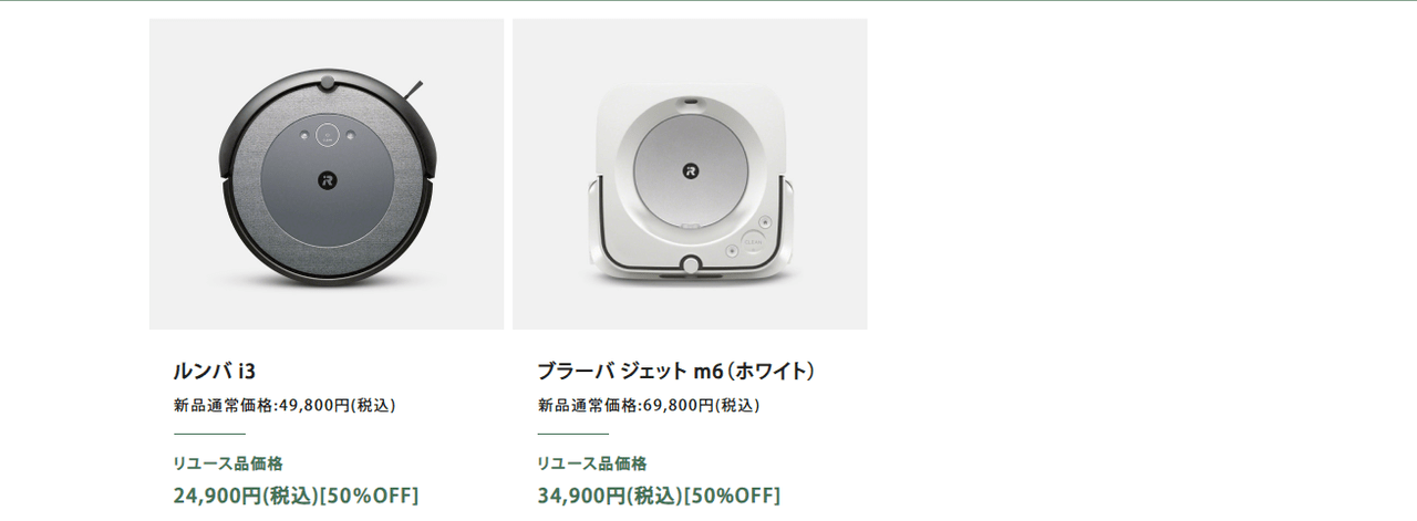 現在の価格ではありますが、ルンバi3の公式整備済品が24,900円と最安値です。(2024年2月5日時点)