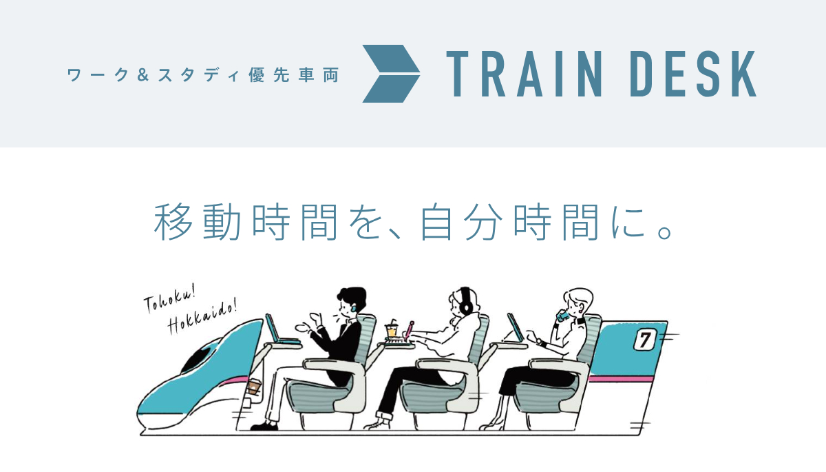JR東日本では、平日の一部車両でワーク&スタディ優先車両「TRAIN DESK」を実施しています。普通車指定席設定のある東北・北海道・上越・北陸新幹線全列車で利用できますので、ぜひチェックしてみてください。