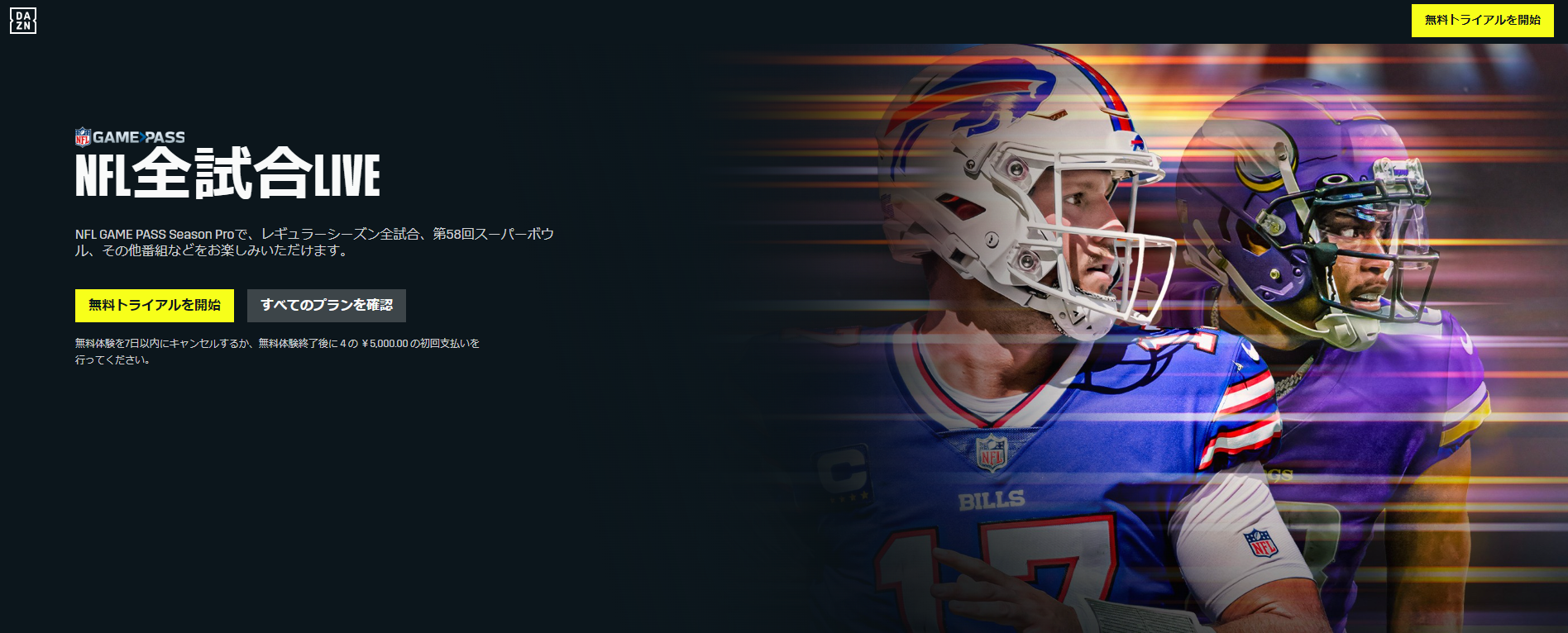 一方で、スポーツ専門のVODサービスであるDAZNで配信している「NFL Game Pass」は、NFLレギュラーシーズンとポストシーズンの全試合を生配信します。