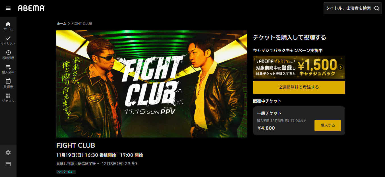 FIGHTCLUB(ファイトクラブ)は、PPV(視聴チケット)を購入することで視聴可能です。また、12月3日(日)23:59まで「見逃し配信」を見ることもできます。
