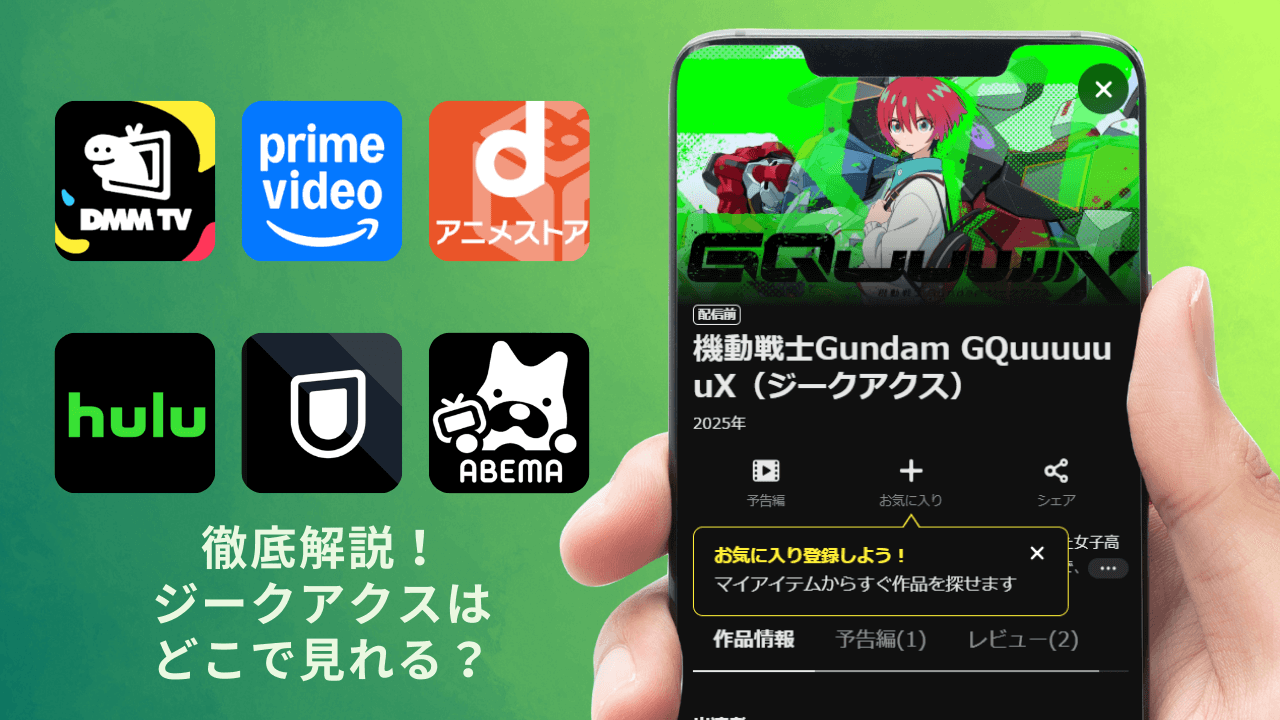 アニメ「機動戦士Gundam GQuuuuuuX(ジークアクス)」の視聴方法を徹底的に解説しました。Amazonプライムビデオをはじめ、多くの動画配信サービスで見放題配信や無料配信が予定されています。