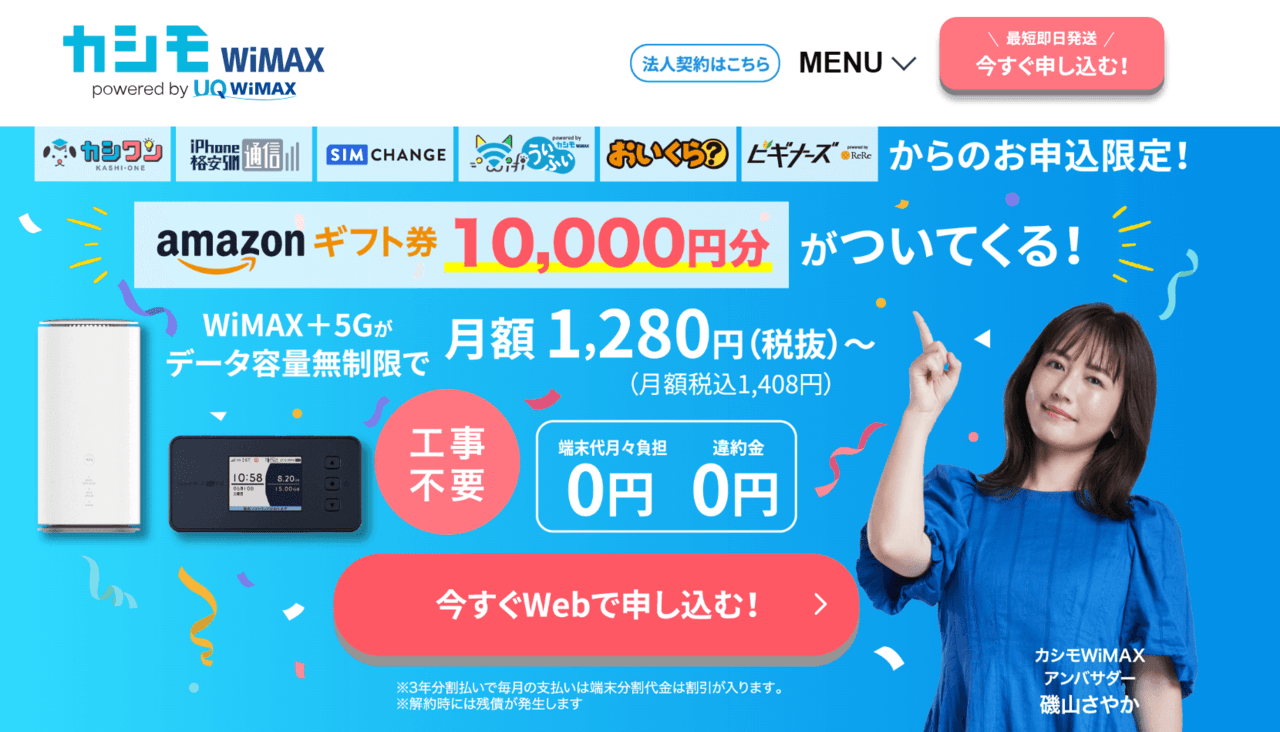 例えば業界最安級で人気のカシモWiMAXは、実質無制限に使えて月額1,408円(税込)〜となっています。ぜひ参考にしてみてください。