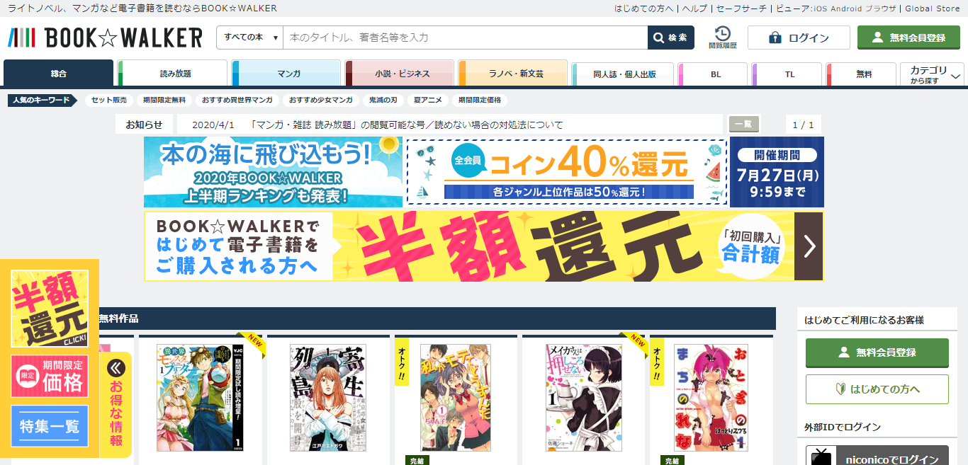 | dブック | 1万冊以上 | ・新規会員登録で50%OFF | リーダーアプリ |