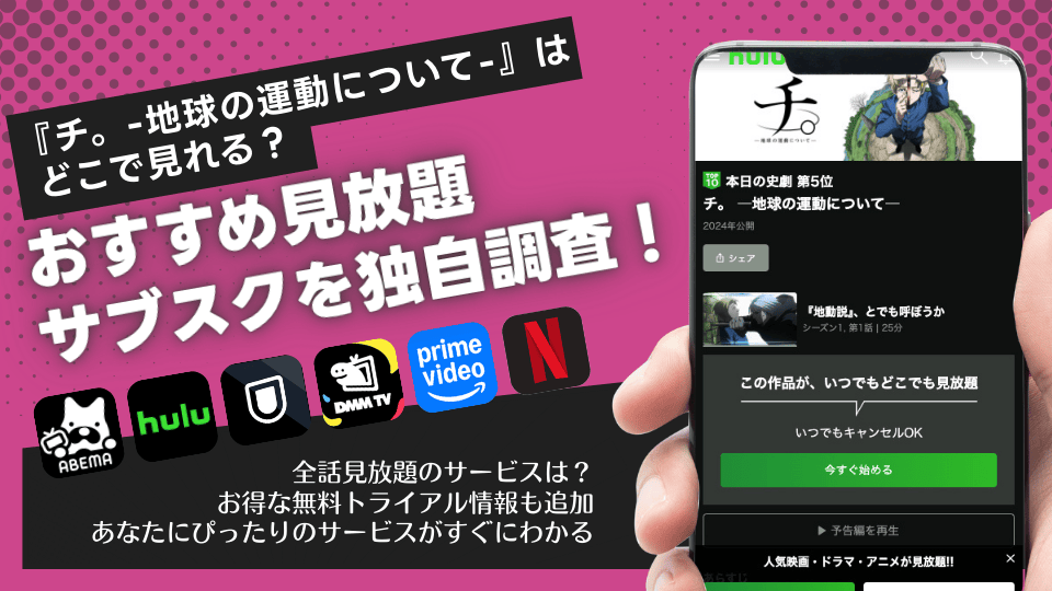 この記事では、「チ。-地球の運動について-」の視聴方法を解説しました。サブスクの無料お試し期間を利用すれば、無料で試聴できます。
