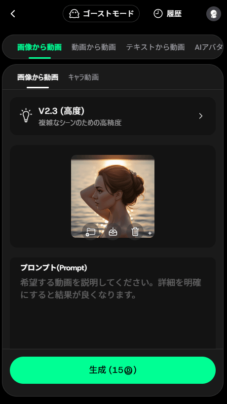 ホーム画面の『AIビデオ』を選択すると生成画面に移動します。これで準備は完了です。
