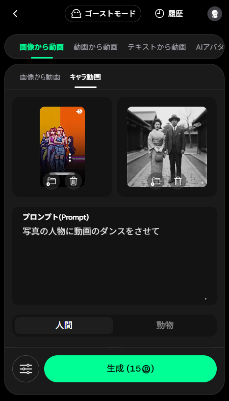 DomoAIでは、一枚のイラストを動かすだけでなく、さらに進んだ「キャラ動画」機能も試せます。