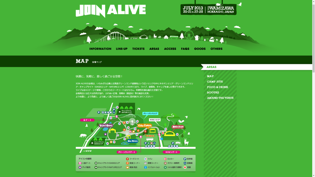 こちらは2016年のJOIN ALIVEの会場マップです。ステージ配置のほかに駐車場やバス乗り場、トイレに物販会場など詳細に記載されております。当日パンフレットにも記載されてますが、開催近日になると公式ホームページで公開されますので、事前に目を通しておきましょう。