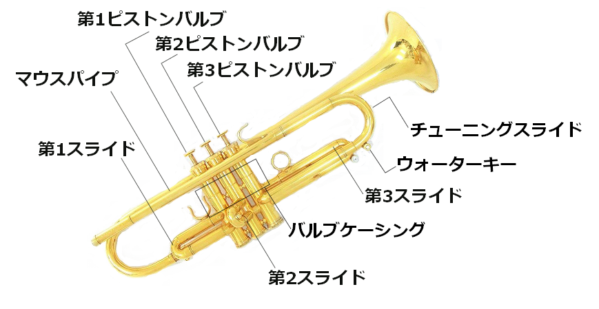 複雑な構造のトランペットを正しくお手入れするために、まずはメンテナンスで必要なトランペットパーツの名称をおさらいをしましょう。
