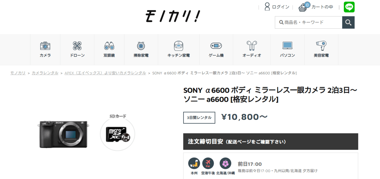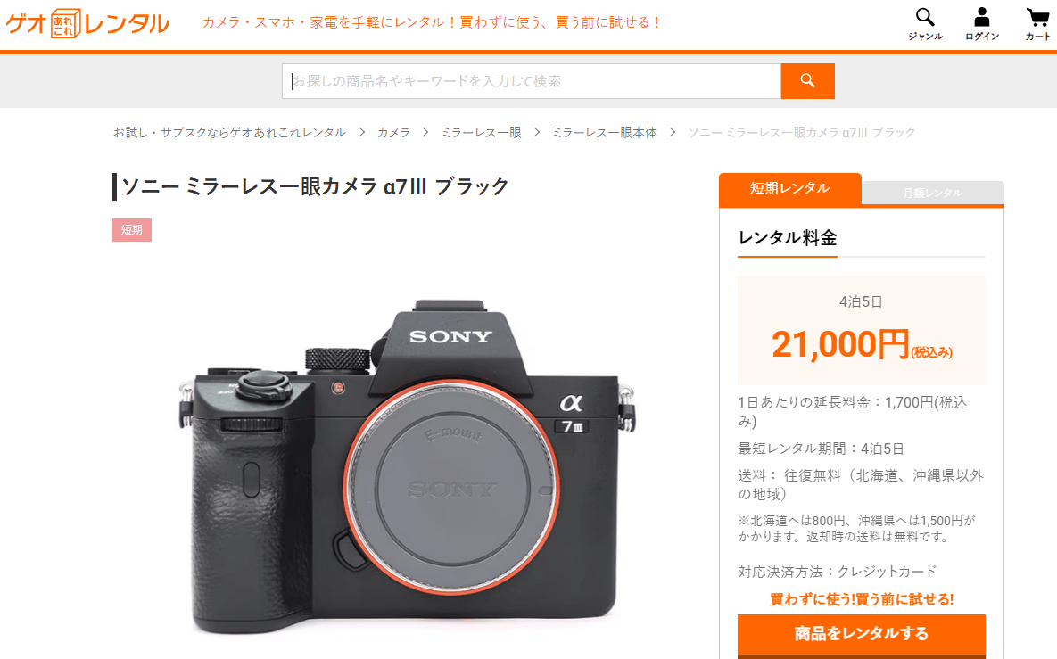 | モノカリ | カメラの場合2泊3日~ | クレジットカード | 往復無料 | 全国 | 宅配or店頭 ※※自宅以外指定可 |