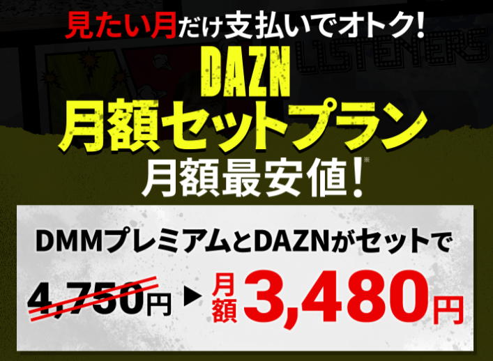 | DMM×DAZNホーダイ | [DMM×DAZNホーダイ月額] DAZN単体より720円お得 |