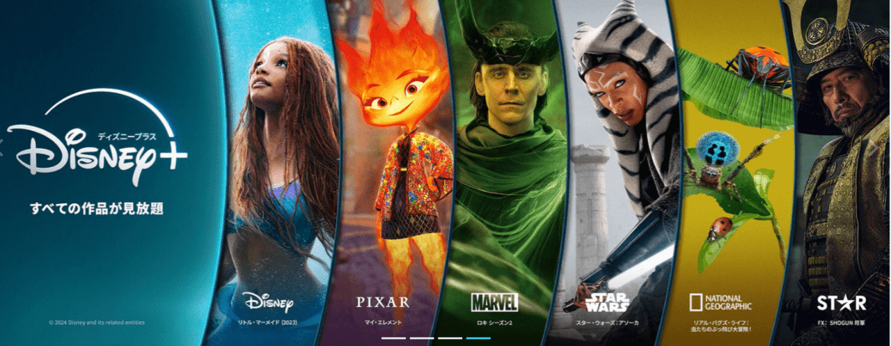 「ディズニー」「ピクサー」「マーベル」「スター・ウォーズシリーズ」「ナショナル ジオグラフィック」「スター」の6大ブランド作品が視聴できます。